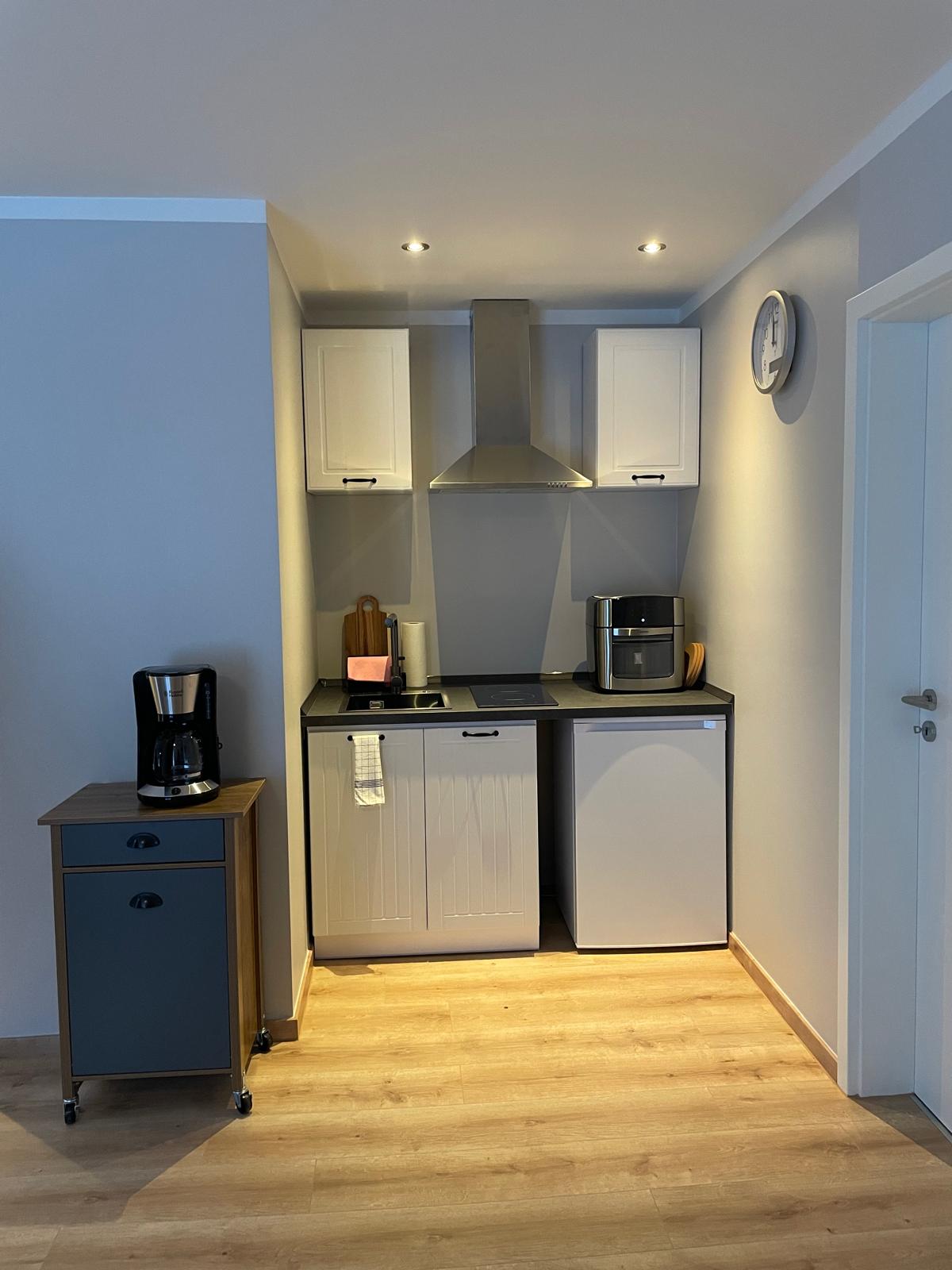 Voll ausgestattete Pantryküche mit Geschirr und Kochgeschirr – von der Tasse Kaffee bis zum Abendessen ist alles möglich.